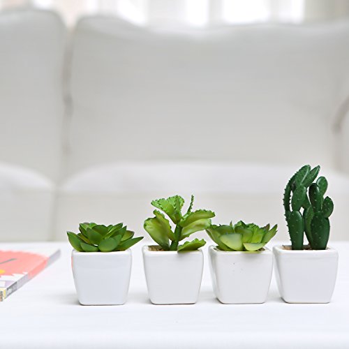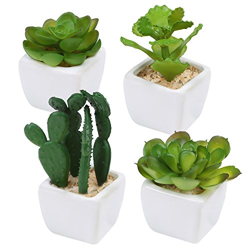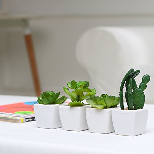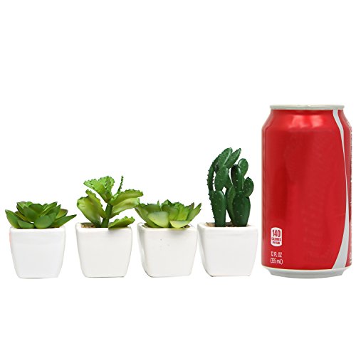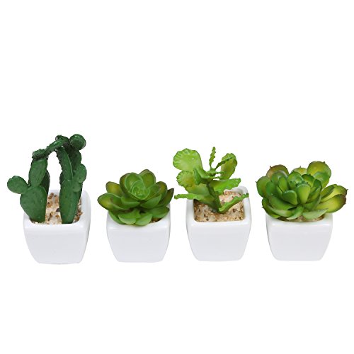If you don't quite have a green thumb, this set of 4 artificial succulent plants is just what you're looking for. Each synthetic plant in this set of 4 is a different type of succulent, from a small and leafy succulent with rounded leaves to classic prickly cacti plants. All four of the faux plants come housed in a small, white ceramic plant pot filled with small pebbles. Group these mini plant pots together or display them separately in your home or office, or give this artificial plant set as a thoughtful gift for family and friends.**Official MyGift® product.**