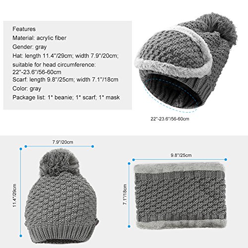 Information Vbiger Warm Hat, Scarf and Mask Set- No more chill in this winter! Crafted with thick plush lining, this practical set will offer you super warm wear experience, which allows you to go shopping, skating, skiing more pleasantly. If you want to know more details or have any questions, please look through the detailed page or contact the customer service. Features Material: acrylic fiber Gender: female Size: Hat: length 11.4"/29cm; width 7.9"/20cm; suitable for head circumference 22"-23.6"/56-60cm Scarf: length 9.8"/25cm; width 7.1"/18cm Color: grey Package list: 1* beanie; 1* scarf; 1* mask Notice * The actual color may vary slightly from the online image due to monitor color settings. * Please allow slight measurement deviation for the data. 0