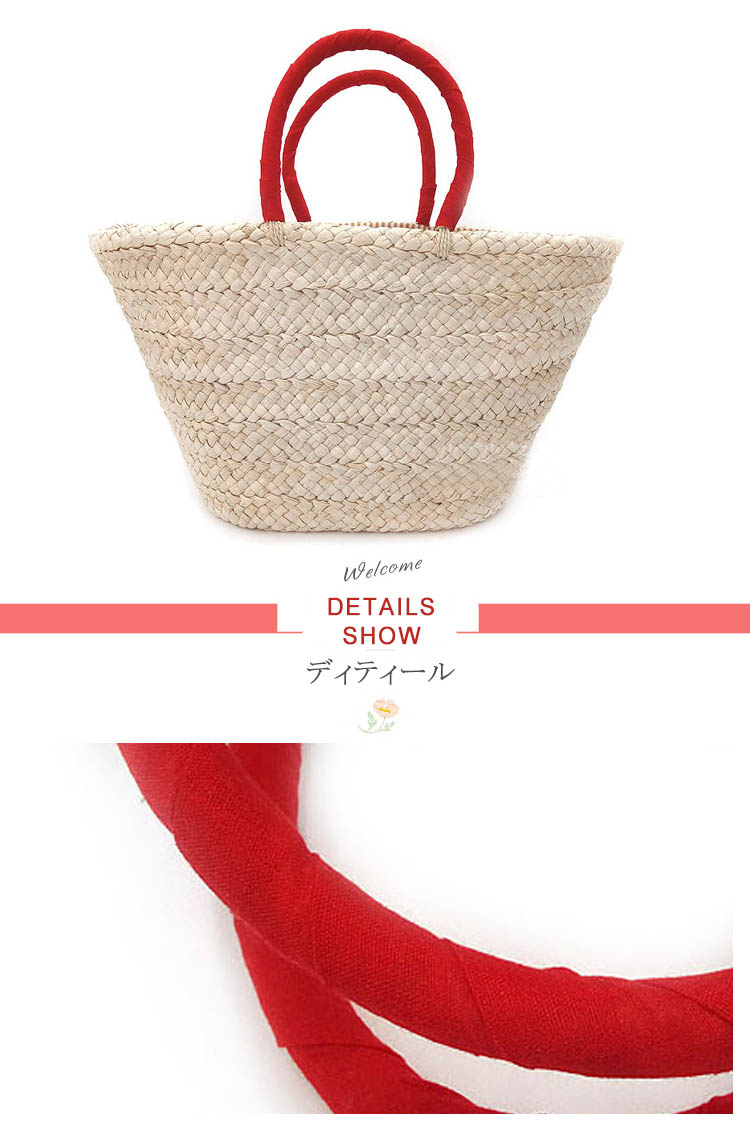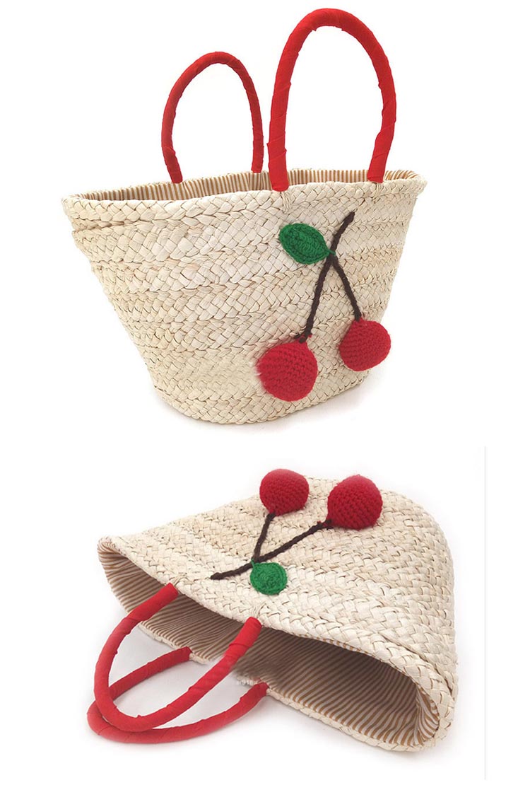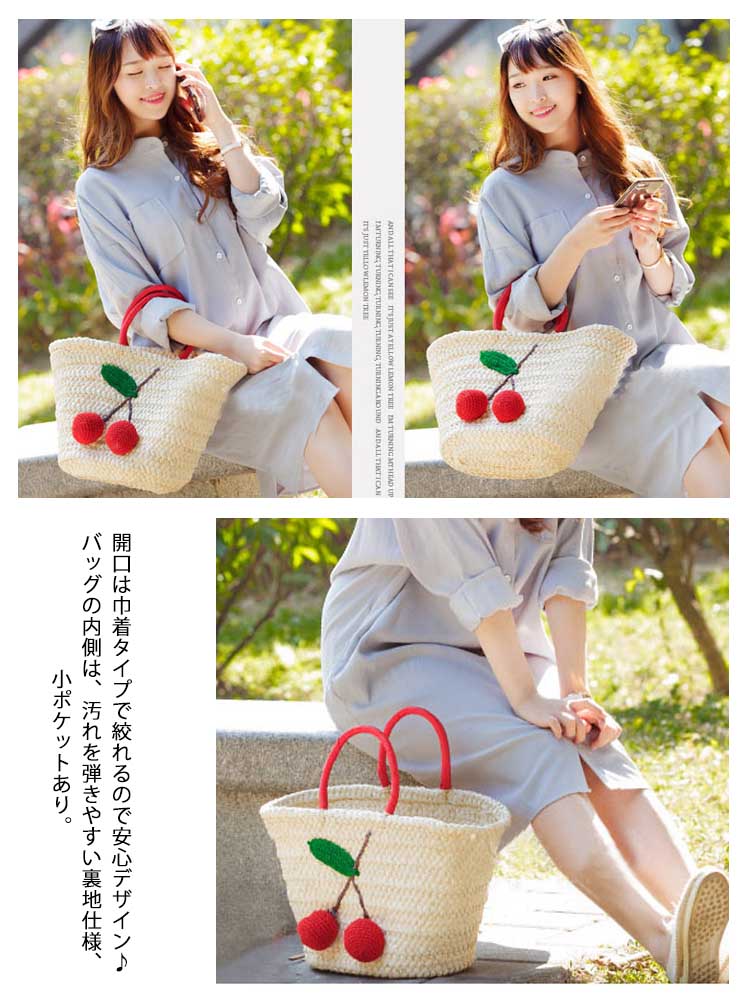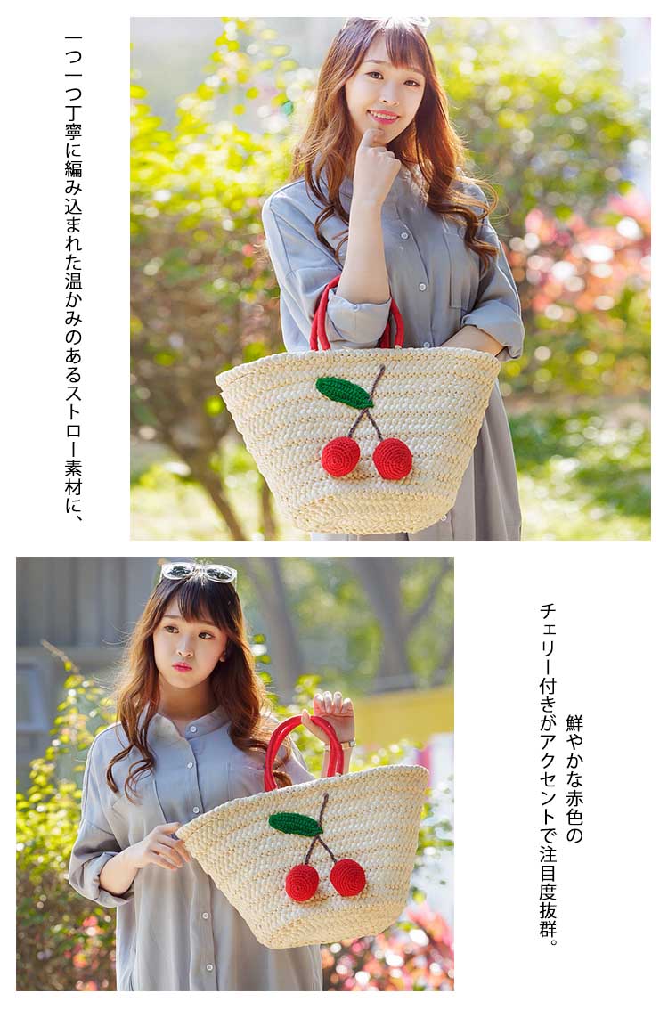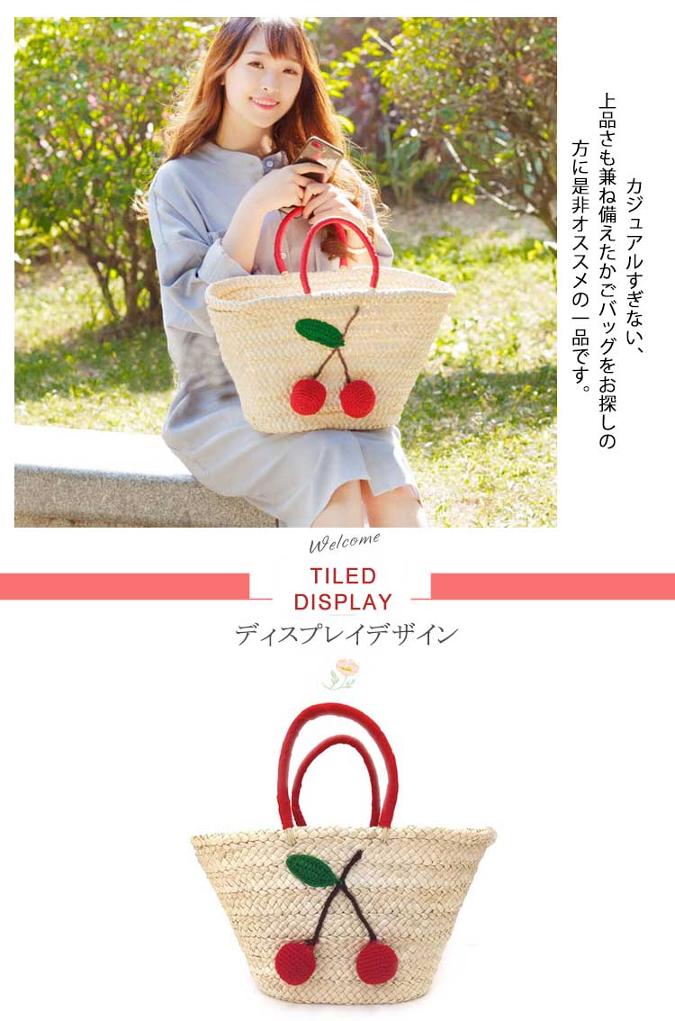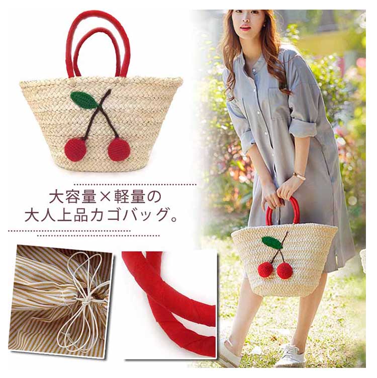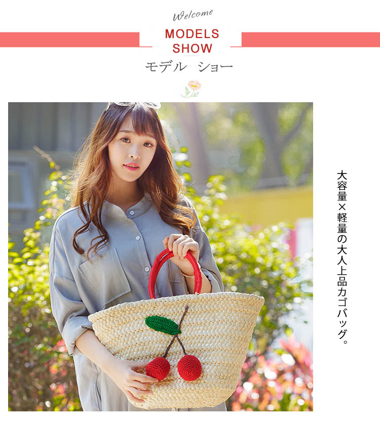 | 大容量×軽量の大人上品カゴバッグ。一つ一つ丁寧に編み込まれた温かみのあるストロー素材に、 鮮やかな赤色のチェリー付きがアクセントで注目度抜群。開口は巾着タイプで絞れるので安心デザイン♪バッグの内側は、汚れを弾きやすい裏地仕様、小ポケットあり。カジュアルすぎない、上品さも兼ね備えたかごバッグをお探しの方に是非オススメの一品です。 | |