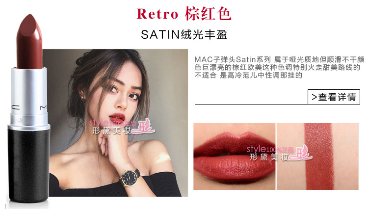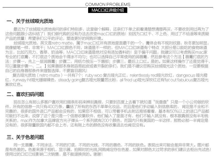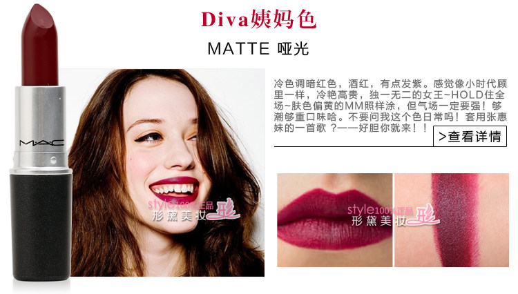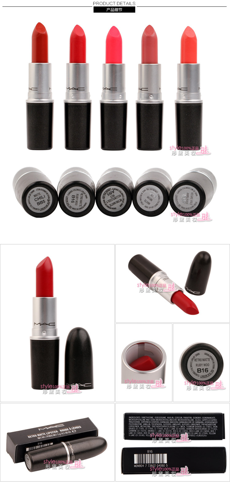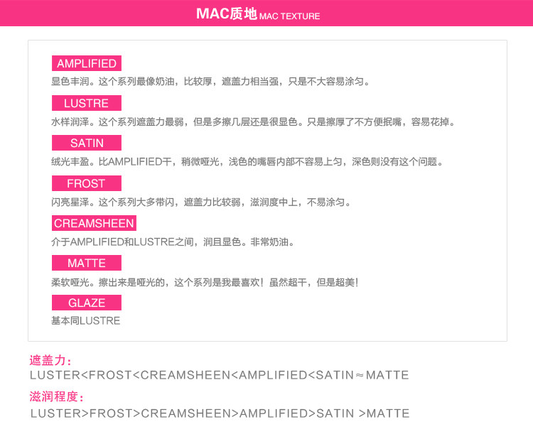 经常有很多客户都会囫囵吞枣的买东西,MAC每款唇膏的膏体都是不同的,唇膏外盒印有膏体的英文,亲们可以仔细看看,店家把膏体来了个综合对比,希望能帮到大家挑选到最合适的宝贝~