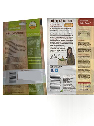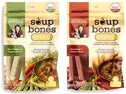 -. Binding : Misc. -. Brand : Rachael Ray -. EAN : 0616878691051 -. Feature : One 4.2 oz (6 bones) Real Beef and Barley Flavor / One 4.2 (6 bones) Real Chicken and Veggies Flavor / Savory, long-lasting chews with a tender, meaty center / Highly digestible with no splintering or mess / Made in the USA! No meat by-products, artificial colors or flavors -. Label : Ainsworth Pet Nutrition -. Manufacturer : Ainsworth Pet Nutrition -. PackageQuantity : 2 -. ProductGroup : Pet Products -. ProductTypeName : PET_SUPPLIES -. Publisher : Ainsworth Pet Nutrition -. Studio : Ainsworth Pet Nutrition -. Title : Variety Rachael Ray Nutrish Soup Bones Minis Dog Treats For Smaller Dogs Real Beef & Barley and Real Chicken & Veggies - Each Pack 4.2 oz/ 6 Chew Treats (Minis) by Rachael Ray -. UPC : 616878691051