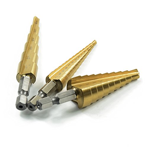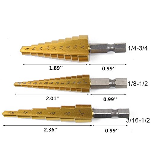 Nizzco Titanium Step Drill Bit Set,3-Piece Set High Speed Steel Bit,1/4-3/4,1/8-1/2,3/16-1/2,Total 28 Sizes