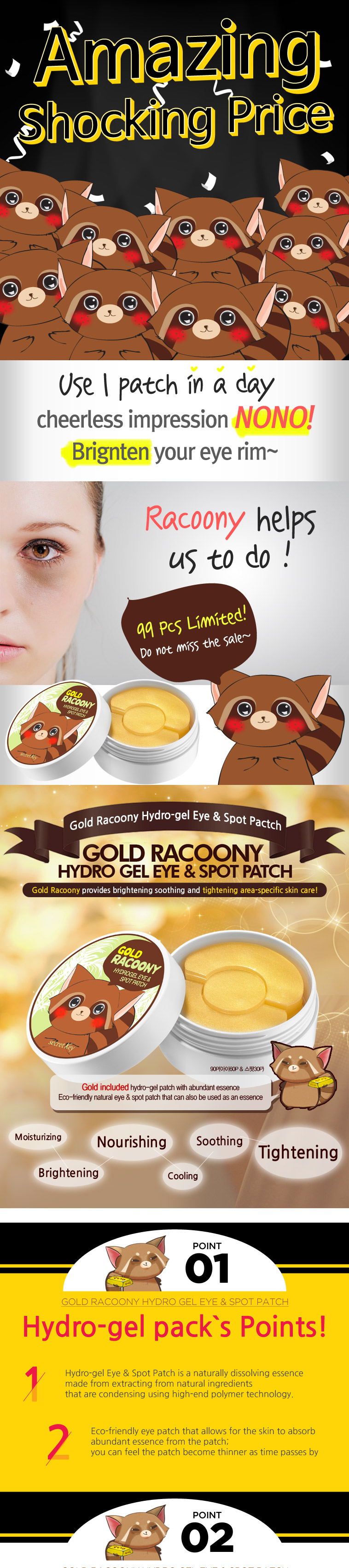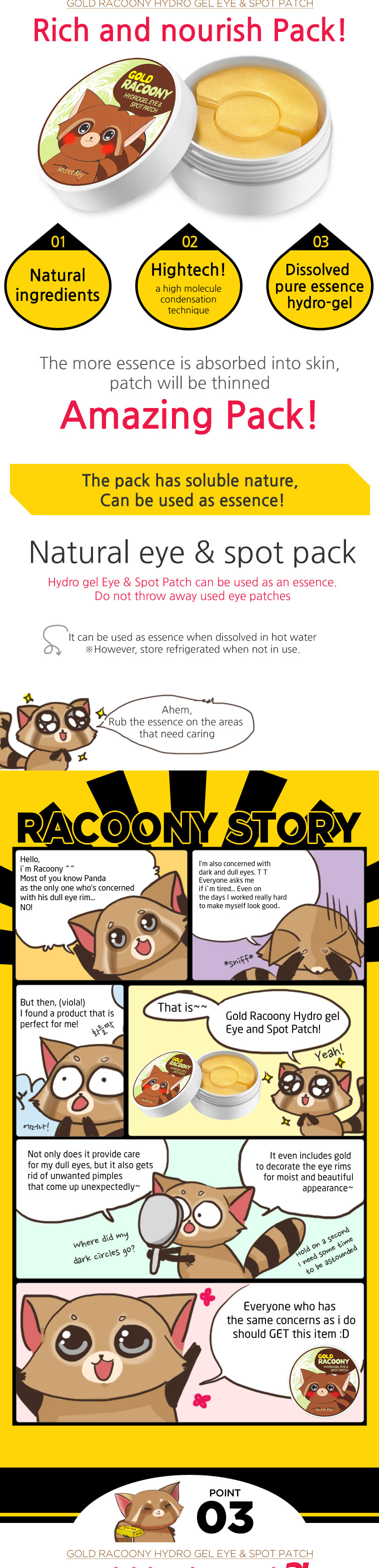 Pink Racoony hydro-gel eye&cheek patch rapidly reduce the skin temperature with 98% of abundant essence, Moisturize and soothe the troubled skin.