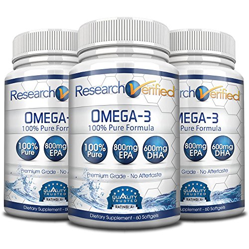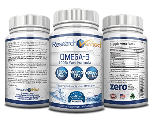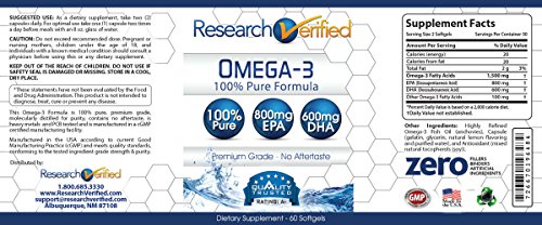 Research Verified 100% Pure Premium Omega-3 Supplement is sourced from the Highest Quality Fish Oil. Each capsule contains 400mg of EPA (eicosapentanois acid) and 300mg of DHA (docosahexanoic acid), which is a total amount of 750mg of Omega-3 Fatty Acids, 100% pure and non-synthetic. The extracts and amounts proven by clinical research to achieve the best health effects. 60 capsules which are 100% pure.