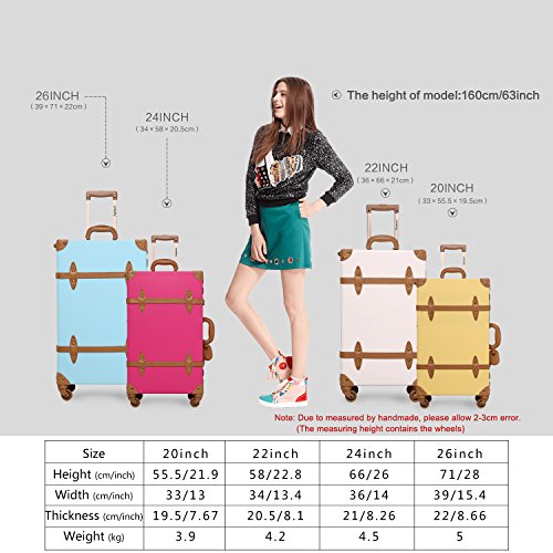 Dimensions: 22 Inch: H 22.8*L13.4*W 8.1 inch (checked suitcase) 24 Inch: H 26.4*L14.6*W 8.5 inch (checked suitcase) 26 Inch: H 28.4*L15.3*W 9.0 inch (checked suitcase) Tips: Manual measuring can have a slight error is normal.
