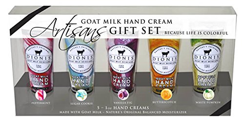 -. Feature : Fragrancea are Peppermint, Sugar Cookie, Vanilla Fig, Butterscotch and White Pumpkin. / At Dionis we know that when your skin feels great, you feel great. That's why we have dedicated more than 30 years to promoting the moisturizing benefits of goat milk. / 5-1oz Goat Milk Hand Creams / The goat milk, and vitamins A and D also keep your skin looking great naturally.