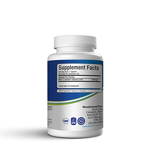 - Feature : ★PRAISED As an Energy and Stamina Booster - Earth Vow Maca Root Extract capsules are nutrient-dense with iron, protein, amino acids, minerals zinc and taurine. It is a nature's miracle anti-stress adaptogen and fatigue fighter to help you get through your day! / ★INCREASE Sex Drive and Libido - A nature's aphrodisiac praised for its libido-boosting powers and ability to restore declining sex drives by increasing sexual desire and well-being. Benefits both men and women. Have a go with Earth Vow maca capsules today and experience these wonderful benefits yourself! / ★NOURISHES Weak Immune Systems - If you have been feeling lethargic, it gives your immune system a much-needed BOOST in strengthening the body against infections and external conditions. These maca root pills help rebuild weak immune systems, nourish bodies, and improve bodily functions essential to support wellbeing. / ★QUALITY and customer oriented - Earth Vow maca root powder is manufactured in a GMP/ FDA registered facility in USA and is considered stable at full potency for two years from the manufacture date. Our customer service team are always ready to answer any enquiry you may have on our maca root herb capsules. / ★SOOTHE Pre-Menstrual Syndrome and Menopause Symptoms - An all-natural form of relief aid for painful PMS symptoms in women by fighting mood swings, stomach cramps, headaches and changing hormone levels. It also alleviates menopausal symptoms such as hot flashes, mood swings, anxiety and nervousness.