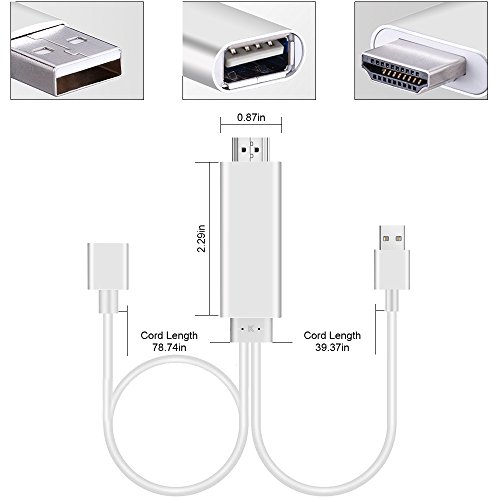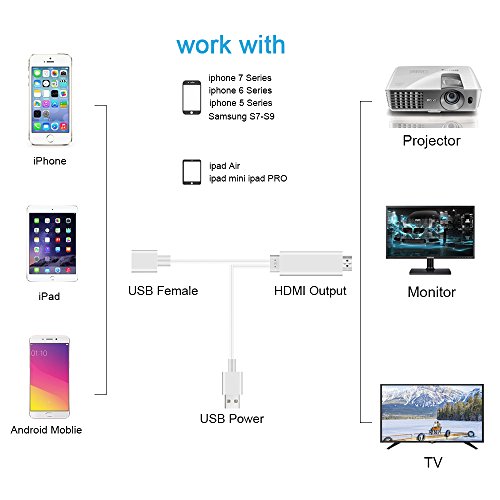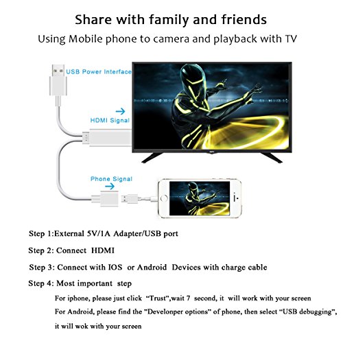 Studio : USBNOVEL Company Publisher : USBNOVEL Company Binding : Electronics Product Description How to use: This lightning to HDMI adapter has three ports, please make sure all ports are well connected, otherwise, it will not work. 1. Plug the HDMI port into the TV/Projector HDMI port. 2. Connect the USB port to a power adapter(5V 1A) or the projector or TV's usb port for power. 3. Plug USB female port into your iPhone/Samsung/iPad through charging cable. 4. Switch the tv/projector's output to corresponding HDMI. 5. For IOS System, the phones' screen will pop out a "Trust" option, just click it and it will connect automatically. 6. For Android Cellphones, please open your cellphone" Developer Options", then choose "USB debugging", then click"OK", it's done. Compatible: For iPhone 5/5S/SE/6/6 Plus/6s/6s Plus/7/7 Plus(iOS 8.0 or above) For iPad mini/mini 2/mini 3/mini 4/Air/Air 2/Pro (Only 3G/4G version of iPads supported) For iPod Toch 5th Generation and 6th Generation For Samsung S7/S8/S9Note 5 /Note 6 /Note 7 For Huawei P8/P9 Support Resolution:1080p NOT SUPPORT IOS 11 SYSTEM Package Include: 1 x Lightning to HDMI Cable 1 x User Manual 0