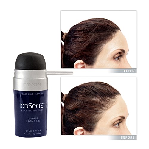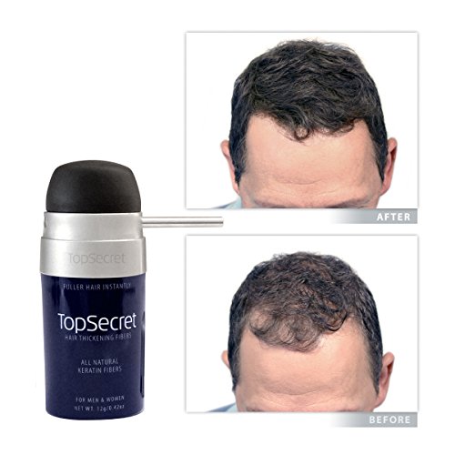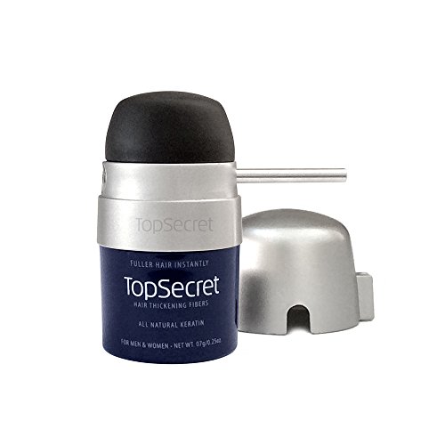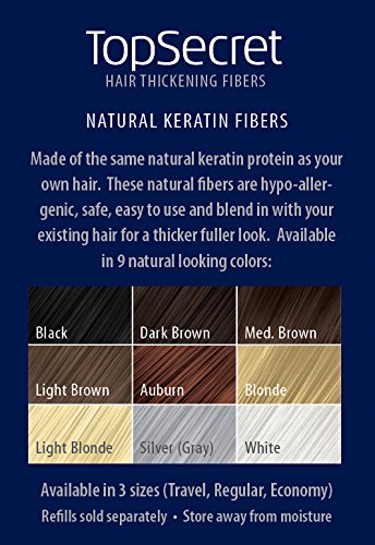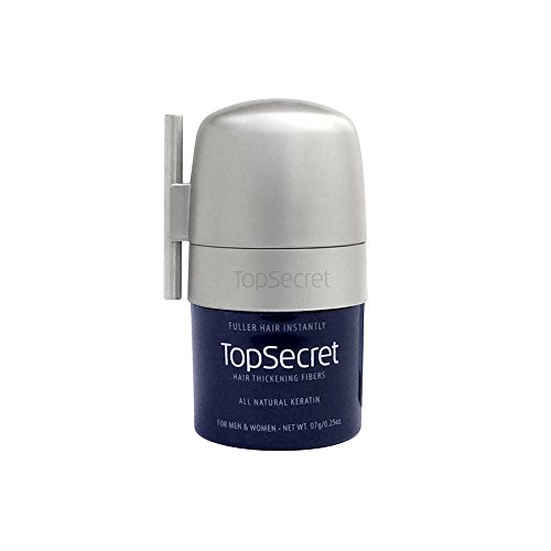 -. Binding : Misc. -. Brand : Top Secret -. Feature : Men and women look instantly younger with wind, rain and sweat resistant natural keratin fibers - that don't come off until you wash them out. New and Improved applicator. More precise, more compact. Now in 3 sizes and 9 Colors. 30 day money back guarantee. / Blends seemlessly with own hair at the scalp. Totally undetectable. Takes seconds to apply. Hair looks instantly thicker. Thinning parts and visible scalp disappear. Covers grey roots to extend time between colorings. / Includes our U.S. patented Air-Burst Applicator that allows for easy, natural looking application. New patent pending compact design takes up less space and protective cap keeps bulb clean at all times. Comes in travel size that fits in your pocket for night out or weekend trips. / Best results and most natural "look" due to ease of use from refined precision applicator and top-of-the-line colors (designed by world renowned Hair Expert ). No more clumping. Perfect for filling in edges and covering grey hair. Can be used on eyebrows, moustaches and beards. / Used by professional hair and make-up artist on Hollywood movie sets and Fashion Week runway models around the world. Voted Best Beauty Product at New York Fashion Week. -. IsAdultProduct : 0 -. Label : Top Secret -. Manufacturer : Top Secret -. ProductGroup : Beauty -. ProductTypeName : BEAUTY -. Publisher : Top Secret -. Studio : Top Secret -. Title : Top Secret Hair Thickening Fibers - New Compact Design!