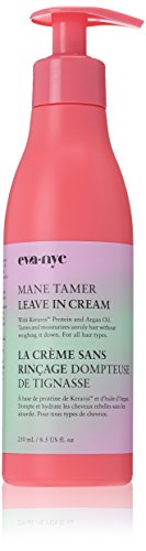 -. Binding : Health and Beauty -. Brand : EVA NYC -. Color : multi/none -. Department : womens -. EAN : 0817574011932 -. Feature : With keravis protein and argan oil / Tames and moisturizes unruly hair / Doesn't weigh your hair down / For all hair types -. IsAdultProduct : 0 -. Label : EVA NYC -. Manufacturer : EVA NYC -. Model : EV50.10312 -. MPN : EV50.10312 -. NumberOfItems : 1 -. PackageQuantity : 1 -. PartNumber : EV50.10312 -. ProductGroup : Beauty -. ProductTypeName : BEAUTY -. PublicationDate : 2014-07-03 -. Publisher : EVA NYC -. ReleaseDate : 2014-07-09 -. Size : 8.5 oz. -. Studio : EVA NYC -. Title : EVA NYC Mane Tamer Leave In Cream 8.5 Oz with Argan Oil and Keravis -. UPC : 699107476803