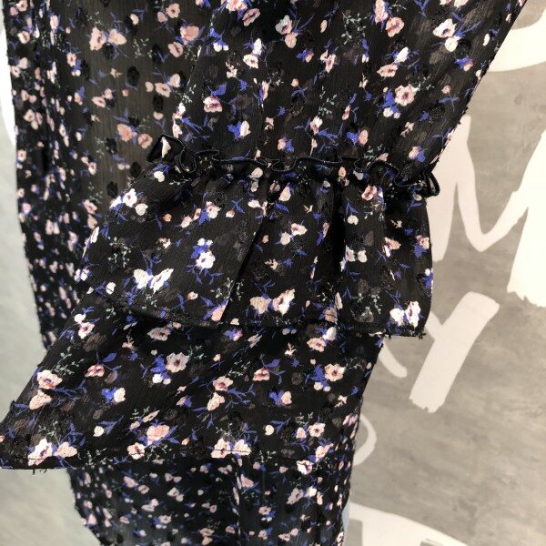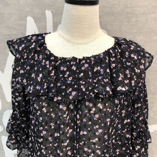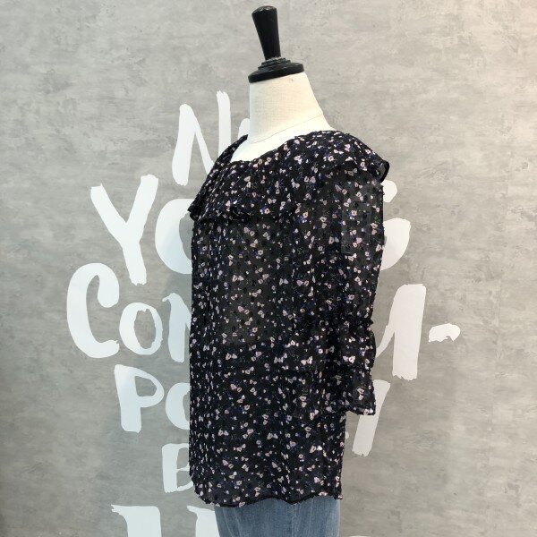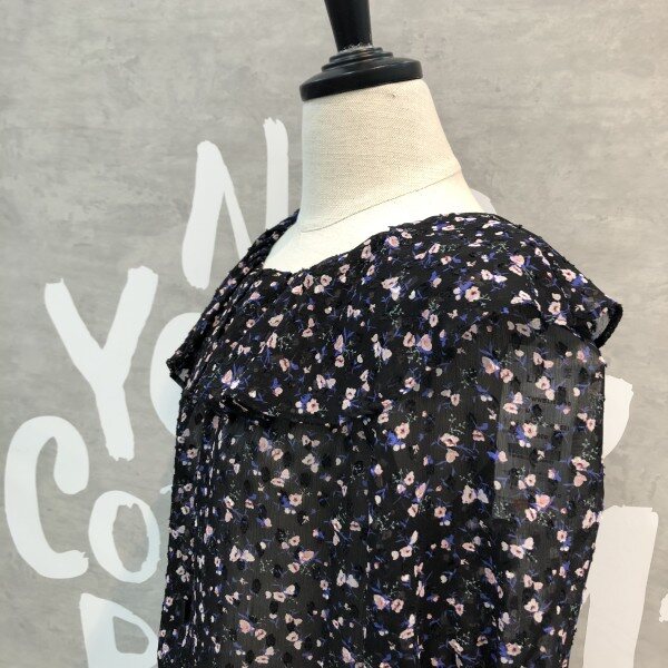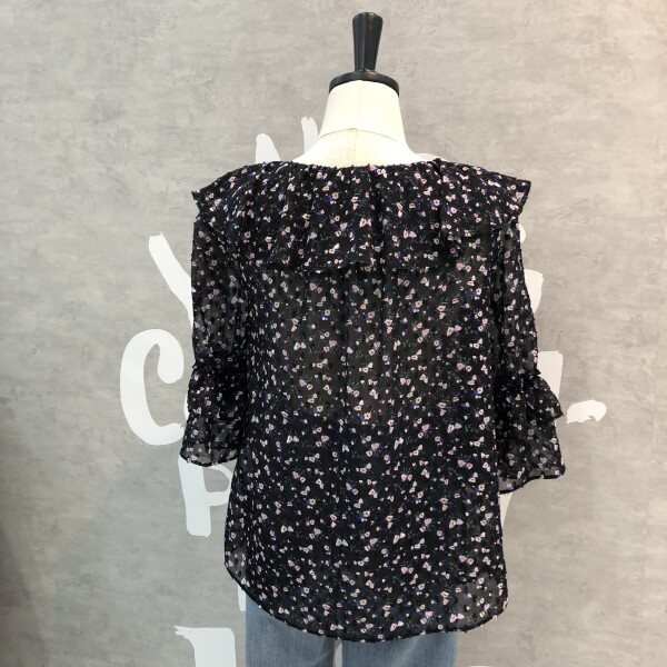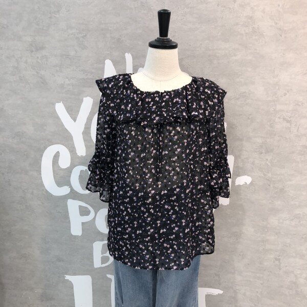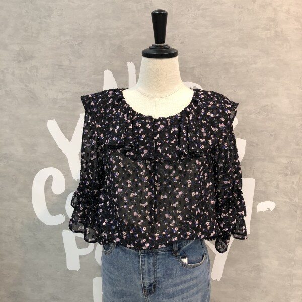 은은한 플라워패턴이 세련된 시스루 블라우스로 소매프릴과 라운드 넥이 여성스러운 디자인의 시원한 아이템입니다