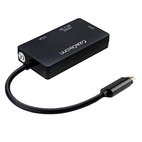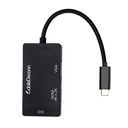 Studio : CableDeconn Publisher : CableDeconn Binding : Electronics Product Description The CableDeconn Multiport USB Type C (Thunderbolt 3 Compatible) to HDMI 4K/DVI/VGA Multi Port Adapter Cable Converter provides you with more options, you can choose available HDMI,DVI, VGA to connect your computer to an external monitor. Specification: Input Computer Connector: USB3.1 Type-C Male HDMI Output Display Connector: Support video resolutions 4K Ultra HD UHD 4Kx2K@30Hz (3840*2160), including 720p, 1080P (1920 x 1080 @ 60 Hz) DVI or VGA Output Connector: Support video resolutions 1920 x 1080 @ 60 Hz PLEASE NOTE:This adapter can support to connect VGA and HDMI or VGA and DVI External Displays to work at the same time, If you connect VGA and HDMI Screens at the same time, the Display Resolution will depends on VGA Port,so it can max support to 1080P.But The HDMI and DVI can not display in a time. USB Type C Compatible Devices (Partial List) -New 2017 Macbook Pro(Two Thunderbolt 3 Ports) - 2015/2016 MacBook 12" - ChromeBook Pixel 2015 - Dell XPS 12 (9250), Dell XPS 13 (9350/9550) XPS15 - HP Spectre 13, HP Elite x3, HP EliteBook Folio G1 -Smartphone Samsung Galaxy S8 -Lenovo Miix 510 Notes: 1. The adapter is not compatible with devices which do not support the protocol of DP Alt Mode. 2. This adapter is only designed for computer Support DP Alt Mode, not for tablets and smartphones(Except for Samsung Galaxy S8 and Lenovo Miix 510). 3. If you would like to get 4K UHD Video,Please only connect HDMI Port Individually to External Monitor,Meanwhile,it requires you to have 4K Source,4K Cable and 4K Screens. 4.For certain monitors such as Philips 288P6(4K@30Hz), Dell P2715Q (4K@30Hz) may turn on and off every minute as connected with a long HDMI/VGA/DVI cable, for stable output, we highly recommend using a short HDMI/VGA/DVI cable within 5.9ft to connect your display. 0