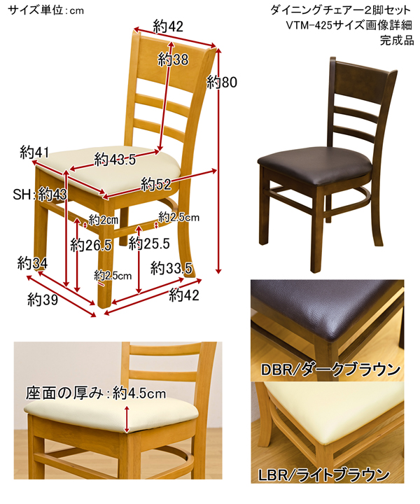 本商品はお取り寄せ商品のため、稀にご注文入れ違い等により欠品・遅延となる場合がございます。誠に恐れ入りますが、何卒ご了承ください。 また、以下の場合には追加送料がかかる場合がございます。  ・大型商品の複数購入時 ・同梱区分が異なる商品の複数購入時  【出荷目安】:1 - 5営業日 ※土日・祝除く 【同梱区分】:TS 1490 【梱包サイズ】:大型商品 【代引き決済】:不可  配送伝票の依頼主は出荷元(メーカーもしくは仕入元)名となる場合がございますので、お受け取りの際はご注意ください。   【型番】VTM425  【商品名の色やサイズについて】 こちらは「ダイニングチェア/リビングチェア 【2脚セット/ライトブラウン】 座面高:約43cm 張地:合成皮革(合皮) 【完成品】」の商品ページです。商品画像や商品情報には、色違いやサイズ違いの商品が載っている場合がございます。ご注文前に色・サイズ・セット内容のご確認をお願いいたします。  買い換えや買い足しにオススメのダイニングチェア 2脚セットです  背もたれは身体にフィットする緩やかなカーブを描いたデザインです 座面は合成皮革(PVC)の張り材を使用 お手入れし易いです  ダークブラウン(DBR)、ライトブラウン(LBR)の2色展開です  幅420×奥行520×高さ800mm(梱包サイズ:幅430×奥行590×高さ890mm) 座面高:約430mm 本体重量:1脚 5.9kg(梱包重量:14.1kg) 完成品(1個口) 積層合板、天然木ラバーウッド(PU塗装) 座面:張り材)合成皮革(PVC)、中材)ウレタンフォーム  原産国:ベトナム  【ご注意事項】 ※本商品は、北海道・沖縄・離島への配送はいたしかねます。あらかじめご了承ください。 ※配送希望日時指定は承りかねます。大変お手数ですが、出荷連絡後、お客様と配送業者との間でご調整ください。