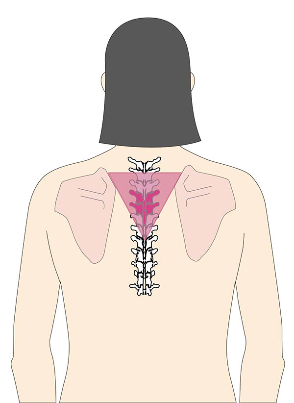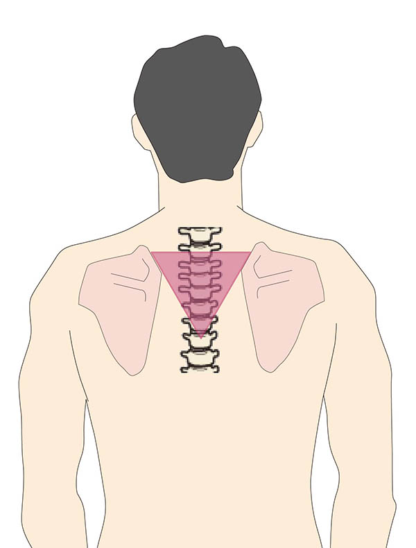 ●胸椎4・5番部分の三角ゾーンにフィットする薄型パッドには2種類のゴムを内蔵。肩甲骨や背骨を支えます。