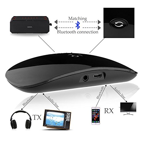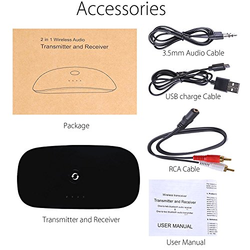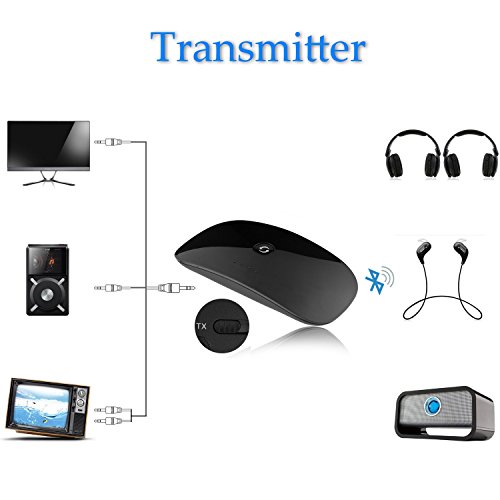 Transmitter Mode: Connect the audio devices(such as MP3, MP4, TV and PC, etc.)via the 3.5mm audio cable or RCA. Easy pairing with Bluetooth headphones, speakers and other Bluetooth devices. Support two Bluetooth headphones or speakers simultaneously