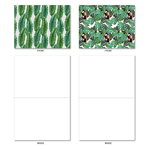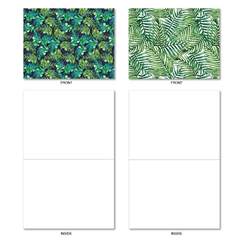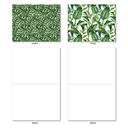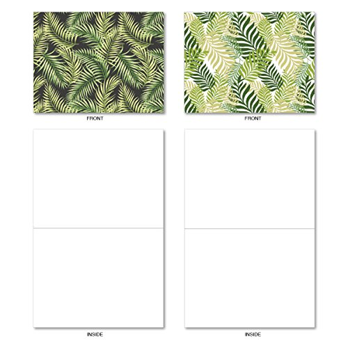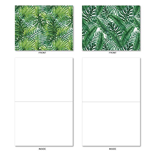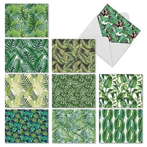 M6483OCB Tropicanopy: 10 Assorted Blank All-Occasion Note Cards Featuring Patterns of Tropical Leaves and Ferns in Gorgeous Shades of Green, w/White Envelopes.