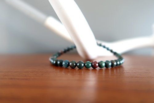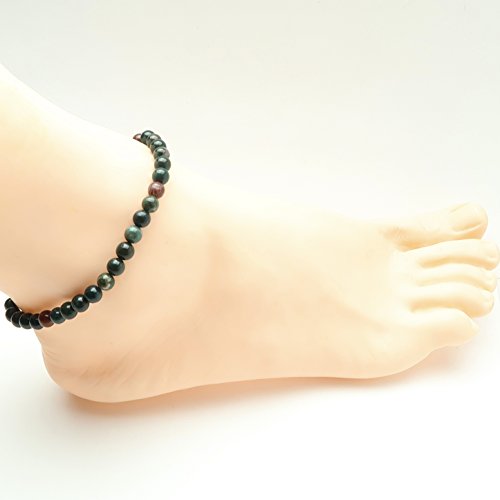 Handmade in California: Natural Bloodstones are strung on your new crystal healing anklet. Bloodstone, also known as Heliotrope, is a form of Chalcedony. Its forest green color is caused by small crystals of Actinolite while the highly-sought red flecks are formed by the presence of Iron Oxides. The green stones may also show white and yellow mineral inclusions and are polished into round beads. The genuine Bloodstone beads are strung on sturdy stretch cord to create your unique anklet.