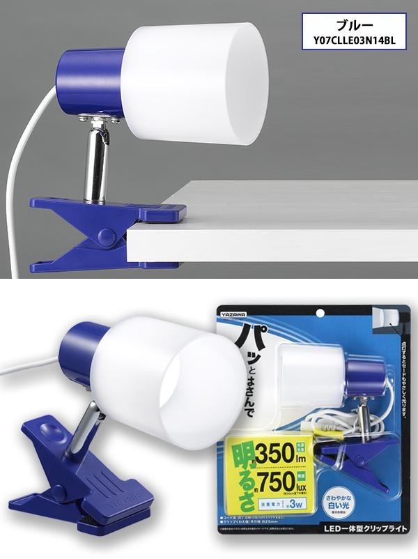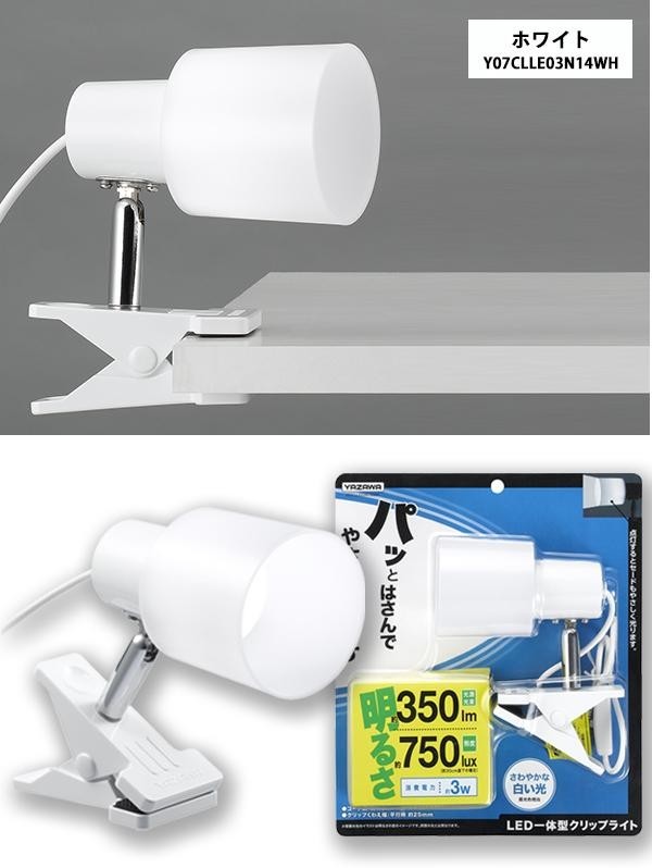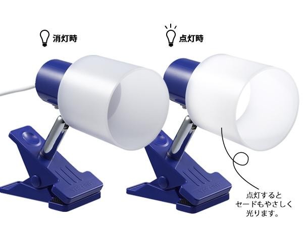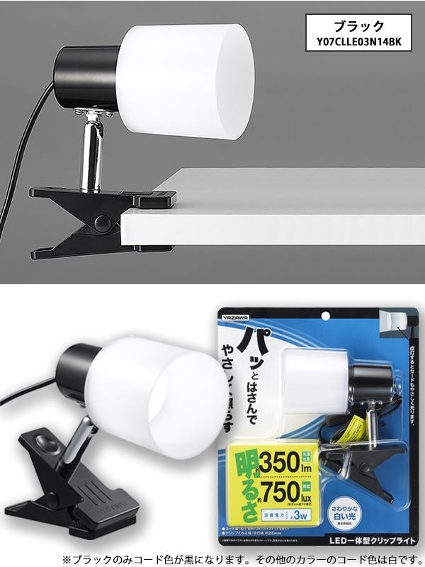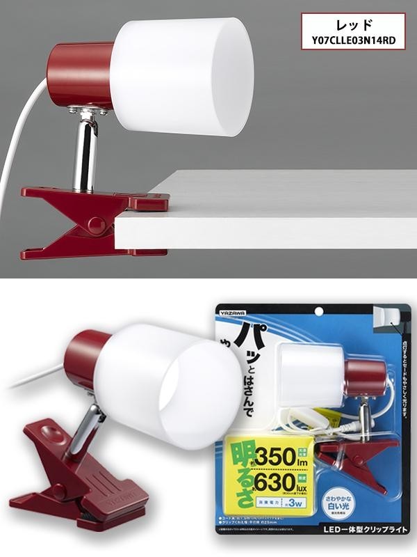 | 仕様 | 光源光束:約350lm 光源:白色LED(交換不可) 照度:約750lux(約30cm直下) 器具光束:約190lm 消費電力:約3W 電源:AC100V コード長:約1.5m(中間スイッチを含む) スイッチ:中間スイッチ(ON/OFF) 調光機能:なし クリップくわえ幅:平行時約25mm 設計寿命:約40000時間 |