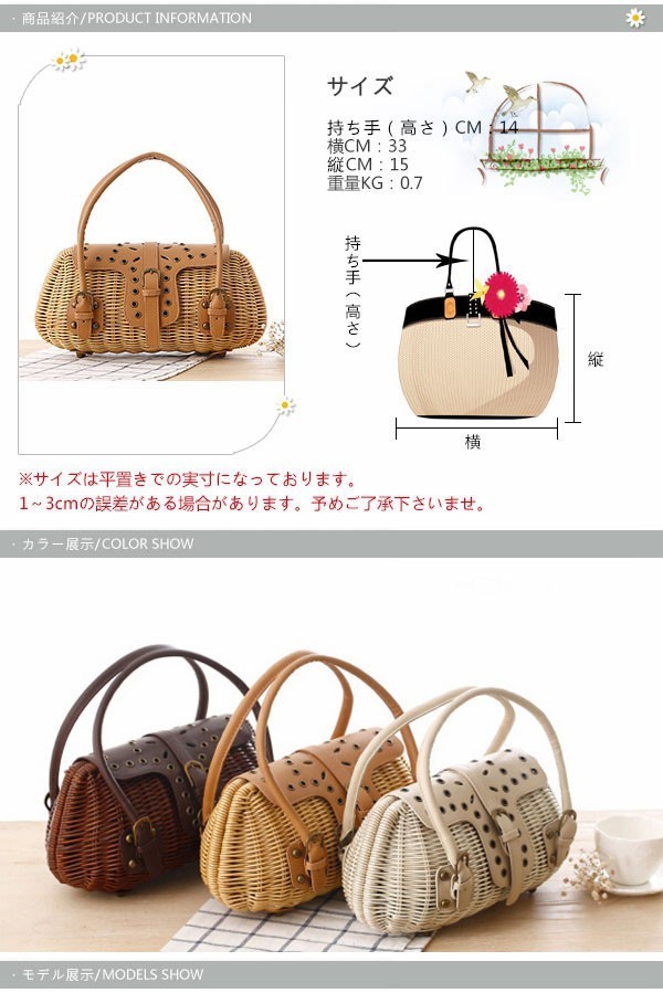★ご注意:こちらの商品はお客様がご入金後、メーカーから取り寄せさせて発送する予定です。ご入金からお届けまで約1-7日ほど時間がかかります。予めご理解いただきました上でご注文下さいますようお願いいたします。★ナチュラルなかごバッグが新登場!★女性のリアルな「欲しい!」から生まれたデザイン!★春夏のお出かけに連れて行きたい、爽やかなバッグ!★女子力もアップする!★持ってるだけで大人可愛いかごバッグ!★素材:ストロー ★重量:約0.7kg★カラー:ブラウン ベージュ オフホワイト(写真参考)※画面上と実物では多少色具合が異なって見える場合もございます。ご了承ください。★サイズ(cm):本体:縦15cm 横33cm 取っ手:14cm※サイズは平置きでの実寸になっております。1?3cmの誤差がある場合があります。予めご了承下さいませ。