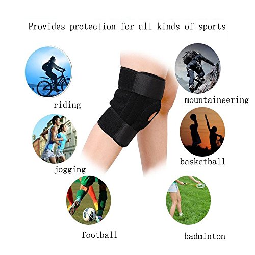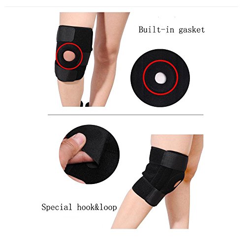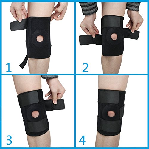 -. Feature : Fitted with four super-elastic metal sP.R.Ings supply strong support, knee brace fully adjustable, fit well and firmly around the knee / An open reinforced patella design, improve comfort and support the knee caps, helps relieve knee fatigue or pain / Four metal sP.R.Ing stabilizers to strengthen and support the knee, knee brace enable the wearer to all kinds of sport / Made of high-grade flock fabrics and Breathable neoprene, absorbs sweat well and comfortable / Excellent quality velcro fasteners that do not fluff easily even when used repeatedly