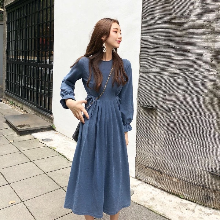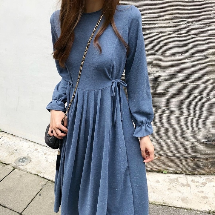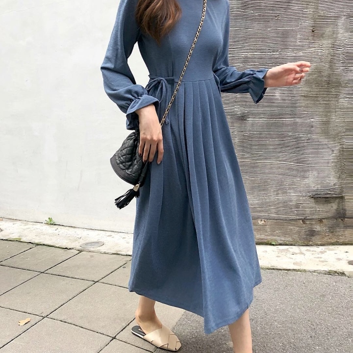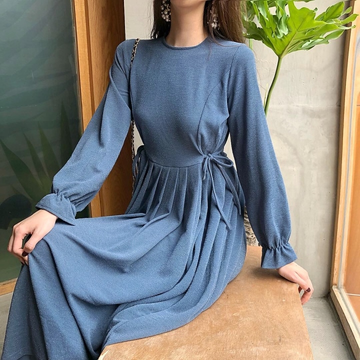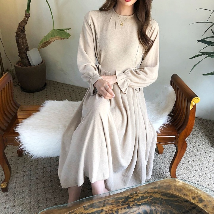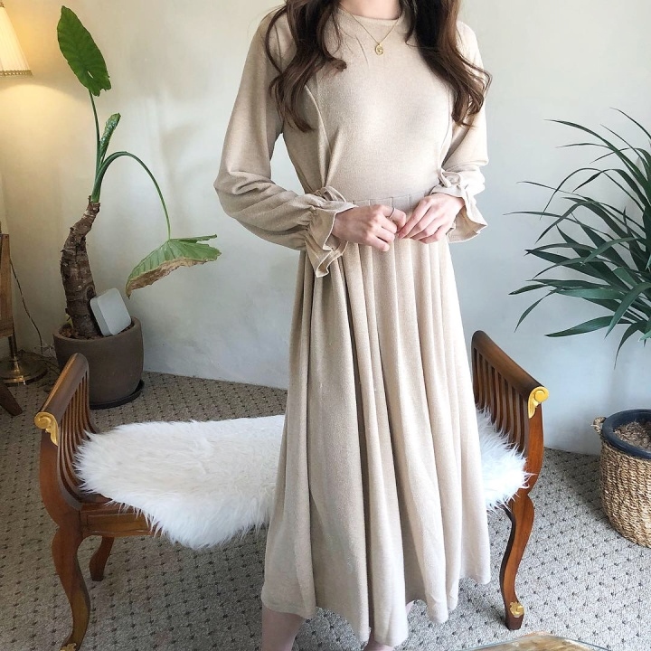 ふんわり フレア袖 クルーネック Aライン ワンピース スパン プリーツ ミモレ丈 長袖 大人フェミニン ボリューム