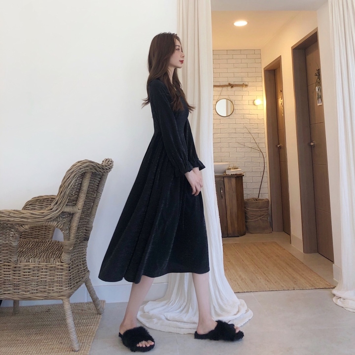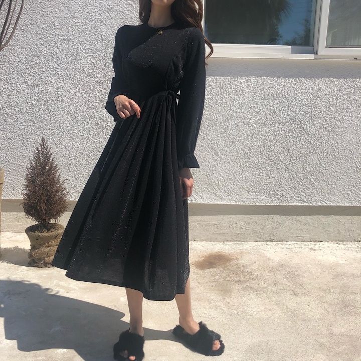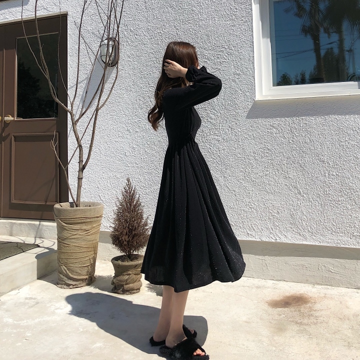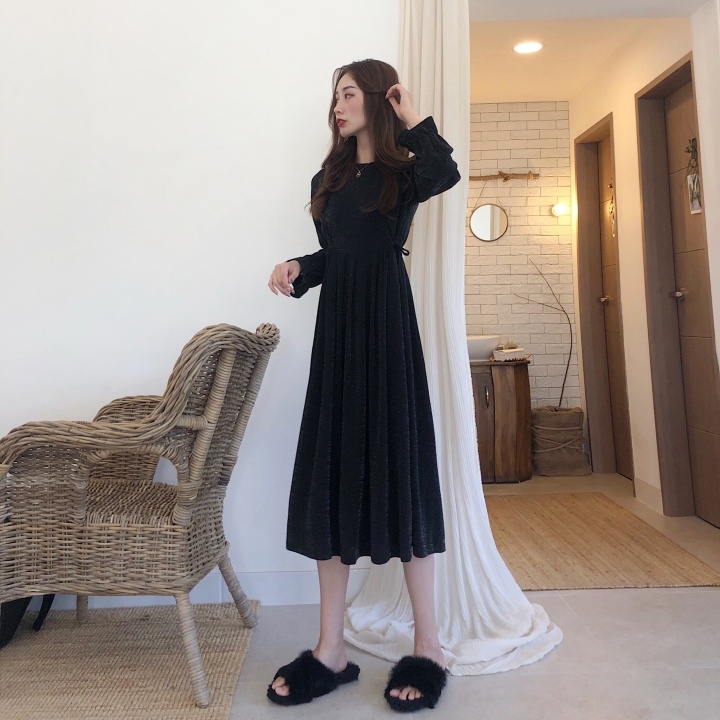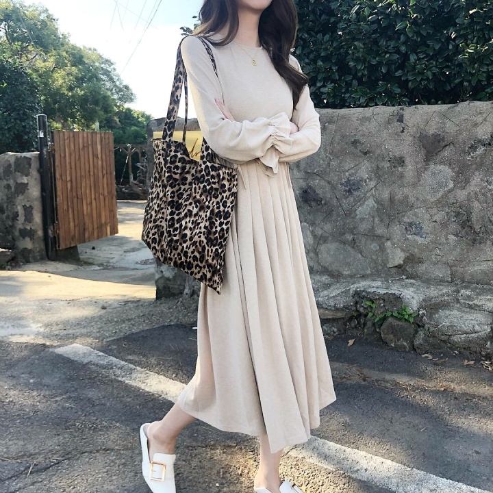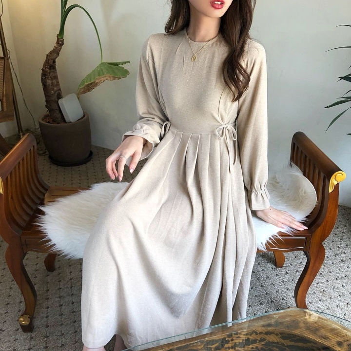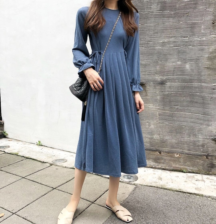 ふんわり フレア袖 クルーネック Aライン ワンピース スパン プリーツ ミモレ丈 長袖 大人フェミニン ボリューム