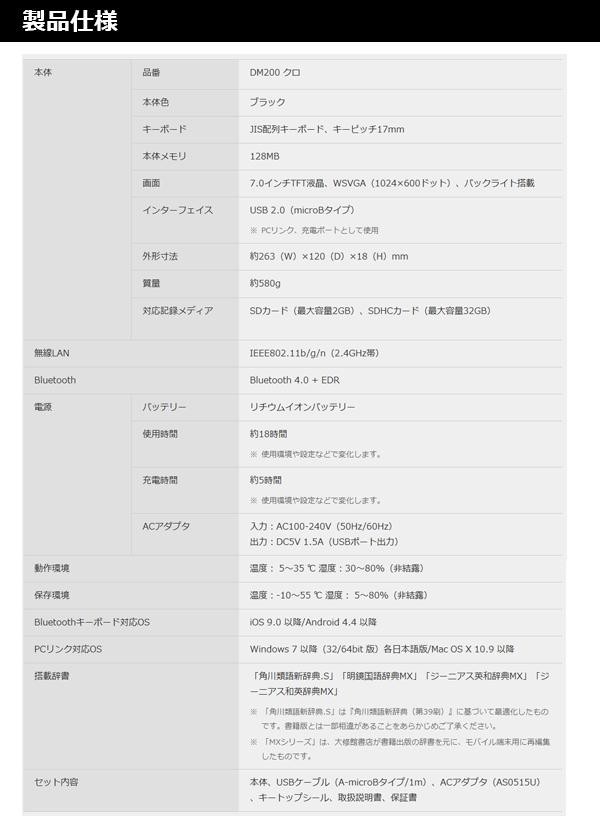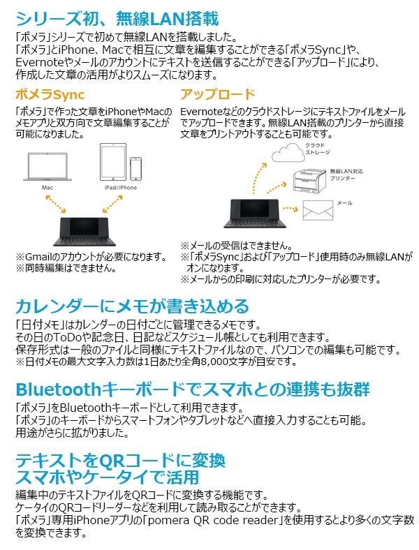 ●無線LAN、Bluetooth(R)搭載機器でも本製品と通信できない場合があります。あらかじめご了承ください。 ●精密機械ですので、取扱いにご注意ください。 ●直射日光の当たる場所や高温多湿の場所での使用・保管はしないでください。 ●本製品に登録したデータは、長期的・永久的に保存することはできません。本製品の故障、修理、電池消耗などに起因するデータの損失および逸失利益につきましては、メーカーでは一切その責任を負いかねますのであらかじめご了承ください。 ●本製品は日本国内専用です。This product is for use only in Japan. ●商品の液晶部分の文字・イラストはハメコミ合成です。 ※Windowsは米国Microsoft Corporation の米国およびその他の国における商標または登録商標です。 ※「ATOK」は株式会社ジャストシステムの登録商標です。 ※QRコードは株式会社デンソーウェーブの登録商標です。 ※Bluetoothは、Bluetooth SIG 社の登録商標です。 ※Evernoteは、Evernote Corporation の商標です。 ※本製品に搭載されている「UD新ゴR」、「UD黎ミンR」は、株式会社モリサワより提供を受けており、フォントデータの著作権は同社に帰属します。 ※UD新ゴR、UD黎ミンRの名称は、株式会社モリサワの商標です。 ※「角川類語新辞典.S」は株式会社KADOKAWA 編集・発行の著作物です。 ※「明鏡国語辞典MX」「ジーニアス英和辞典MX」「ジーニアス和英辞典MX」は株式会社大修館書店の著作物です。 ※本製品に搭載されているRT-Engineは株式会社リムコーポレーションのフォント描画製品です。 ※Mac は米国 Apple 社の商標または登録商標です。 ※Gmail はGoogle Inc. の登録商標です。 ※Twitterは、アメリカ合衆国また他国々におけるTwitterInc.の登録商標です。 ※Facebookは、FacebookInc.の商標です。 ※「ポメラ」DM200は、GPL、LGPLの適用ソフトウェアを一部使用しております。ソースコードの公開を希望するお客様は、お客様相談室までお問い合わせください。 ※ポメラ、pomera、キングジム、KING JIMは株式会社キングジムの商標または登録商標です。 |