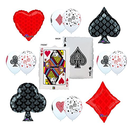 -. Feature : (1) Two Sided 30" QUEEN OF HEARTS / ACE OF SPADES / (1) Each of 22" RED HEART & BLACK SPADE SHAPE FOIL / (1) Each of 18" RED DIAMOND & 18" BLACK CLUBS FOIL / (4) 11" CARD SUITS LATEX BALLOONS / (4) 11" CARDS AND DICE LATEX BALLOONS