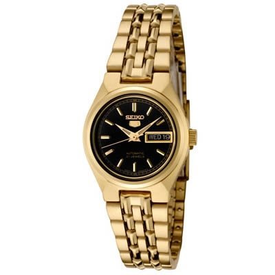 Durable mineral hardlex crystal; brushed and polished gold-tone stainless steel case and bracelet