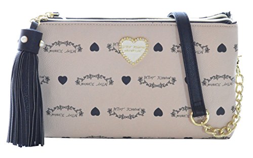 -. Brand : Betsey Johnson -. Department : womens -. Feature : Magnetic snap flap front pocket closure with bow detail and signature hardware / Exterior mainline sand and cream stripe floral print made from PVC faux leather / Detachable adjustable cross-body strap with 27" inch shoulder drop, dangling tassel / Zip around closure opens to center slip, 2 side pockets with 2 media and wall zipper pocket / Messenger Bag: 10.5"x 8"x 1.5" Inches (WxHxD) -. Model : BR24675 -. ProductGroup : Shoes -. ProductTypeName : HANDBAG -. Size : One Size -. Title : Betsey Johnson Double Zip Compartment Tassel Crossbody Clutch Bag