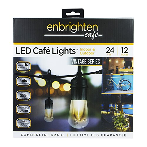 Enbrighten Vintage Series Café LED String Lights (24ft.), 12 Lifetime Bulbs, Premium, Weatherproof, Indoor/Outdoor, Shatterproof, Commercial Grade, UL Listed, 35629