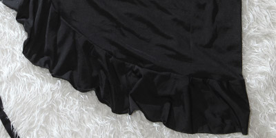 两侧不对称的荷叶边裙摆设计,是此款衣服的设计重点,不同于一般开领设计,在开领口处,以一细绳轻拉住一触即开的衣襟,以新颖的款式锁住你的眼帘。群内配同质地T型小裤。 |
