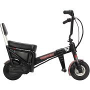 The Chopster E-Motorcycle from Pulse Performance Products brings the rugged, tough look and feel of a real chopper to a child's e-motorcycle. It comes complete with mini ape-hanger handlebars, fold-out foot pegs, and a sissy bar backrest for that authentic, American chopper experience - but for kids! Featuring a 100-watt high-torque motor and dual air-filled rubber street tires, the Chopster is designed for smooth riding on the pavement. The variable speed throttle delivers instant throttle response so kids can move at a speed that makes them comfortable, and riders have secure control over the e-motorcycle with an easy-to-use handbrake. The 24-volt rechargeable battery provides up to 40 full minutes of continuous, easy ride time. A reinforced high-tensile steel frame, fork, and handlebars enhance the motorcycle's durability and safety. Designed for riders 8 years and older, weighing up to 120 pounds.Feature
