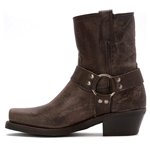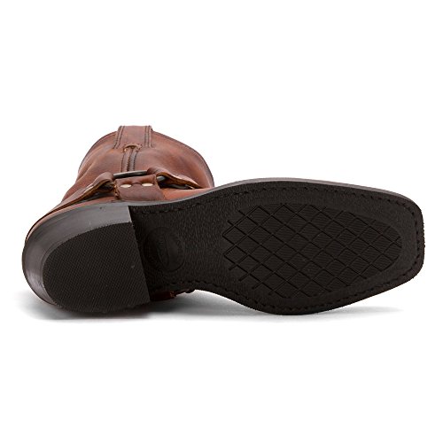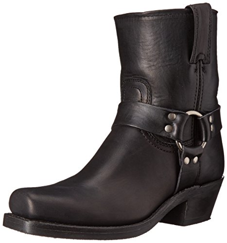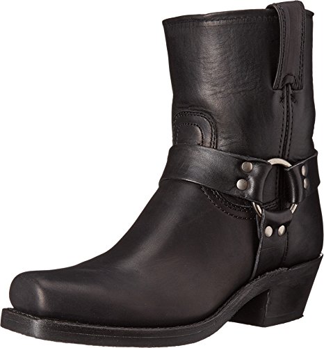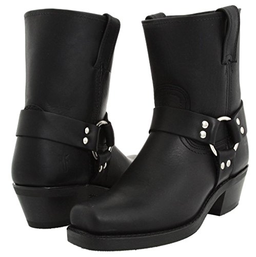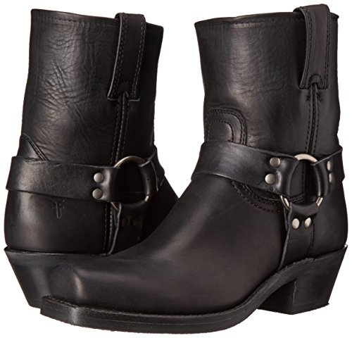 Product DescriptionDistressed leather and a harness overlay compose these Frye boots. Square toe. Pull-tabs at top line. Stacked heel and textured rubber sole.0