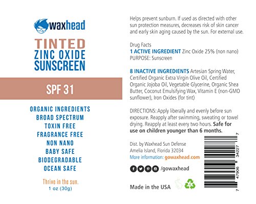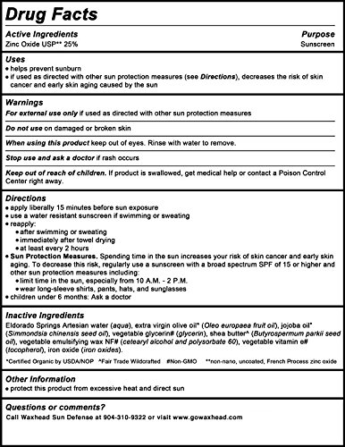 Our non-nano Zinc Oxide Sunscreen stick is specifically optimized for people who participate in active aquatic sports such as surfing and snorkeling, and complies with the 80 Minute Immersion Very Water Resistant standard. Waxhead Sunscreen is free of common allergens and is hypoallergenic. Made in the USA. Light brown tint is from Organic Cocoa Powder, which can stain clothing. Ideal for facial areas.