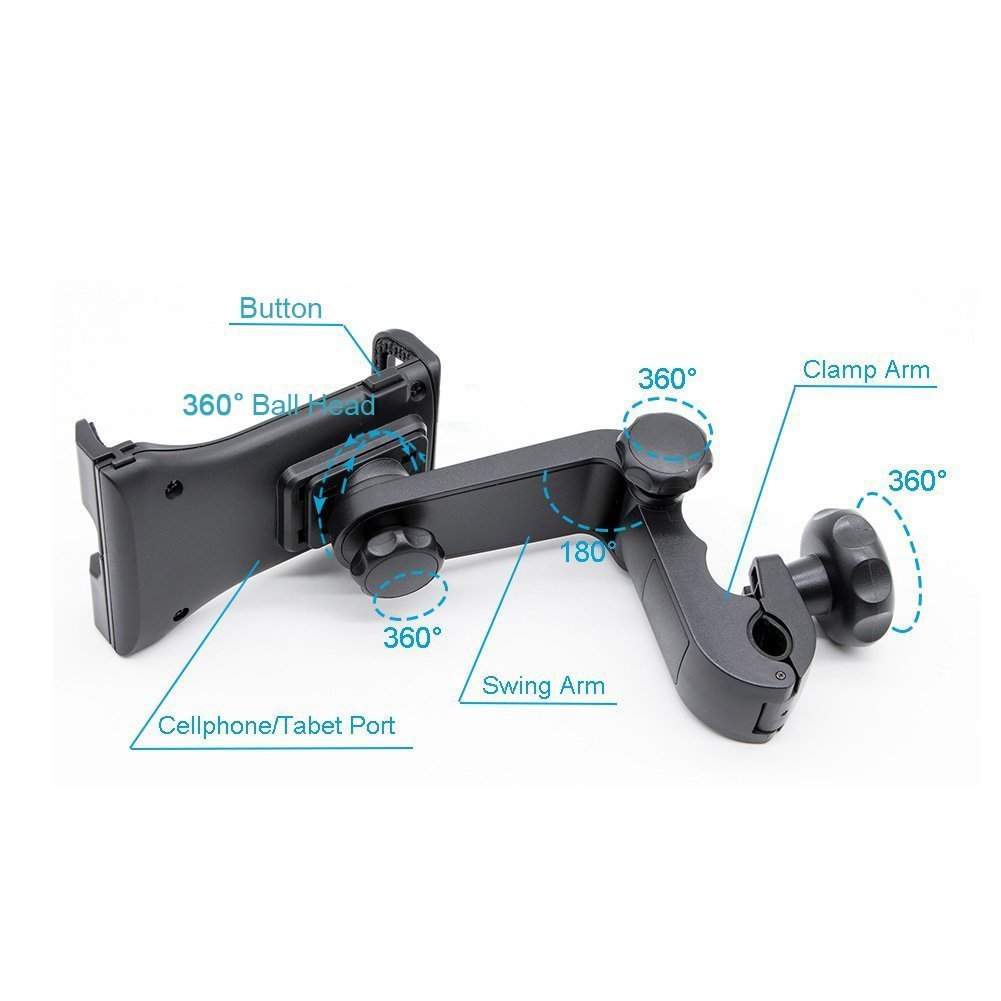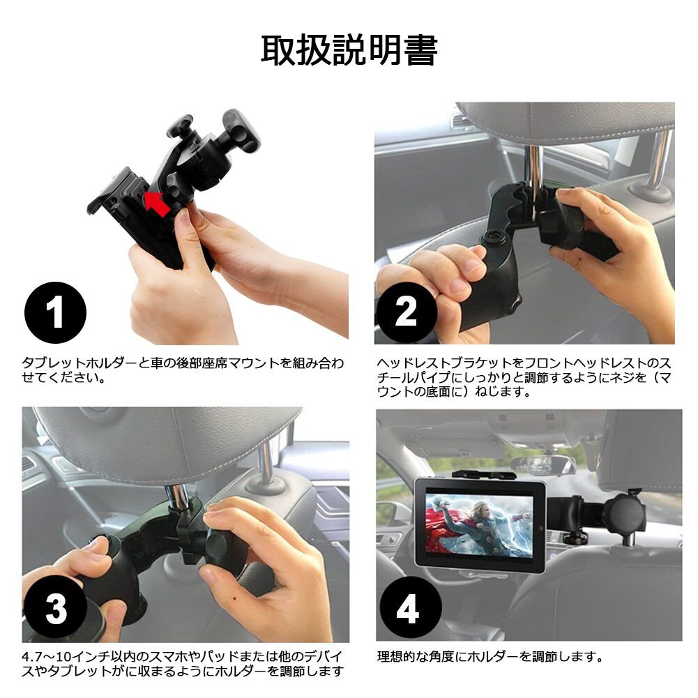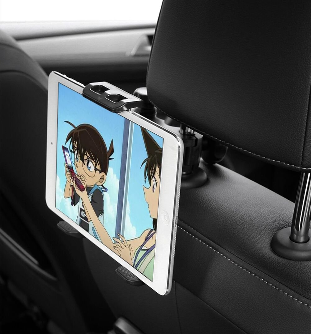 An in-vehicle holder that easily mounts tablets and smart phones in the rear seat at any angle.