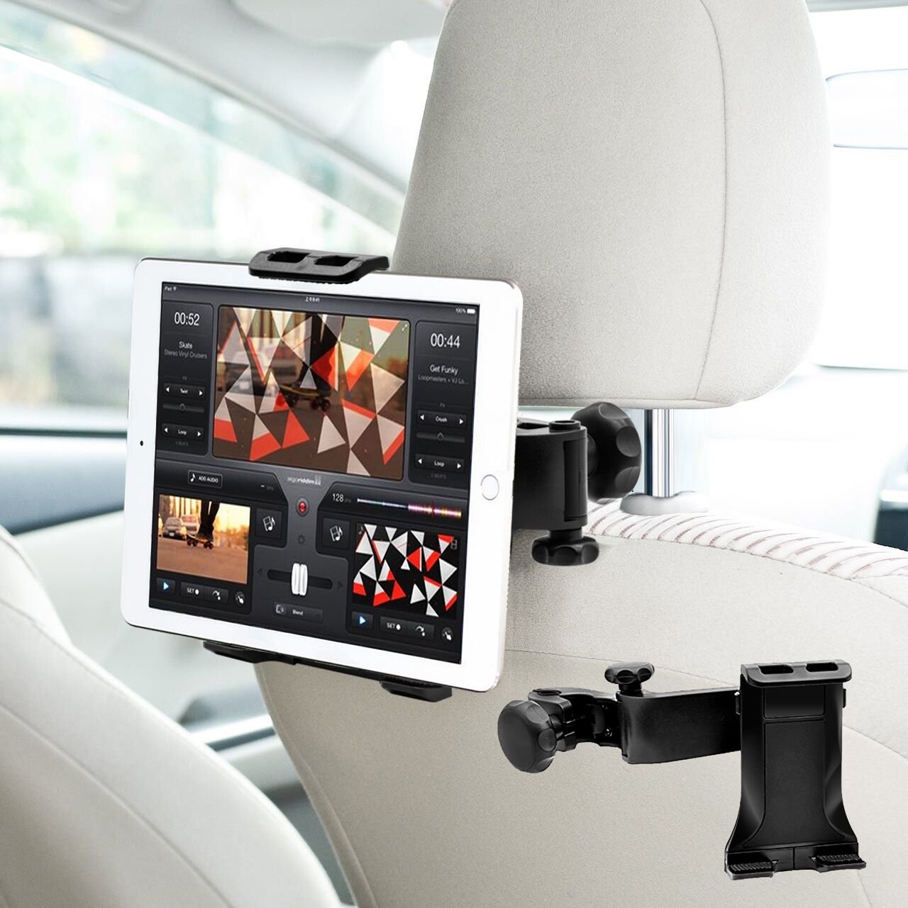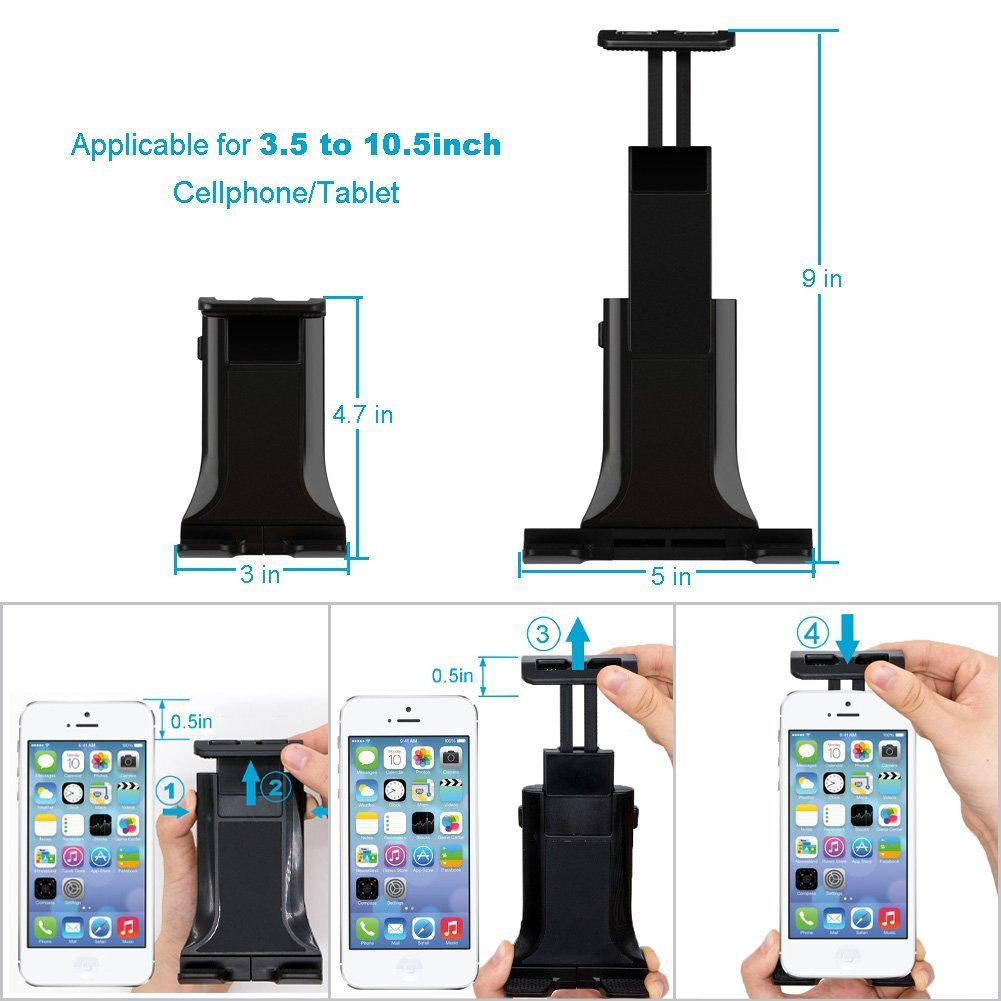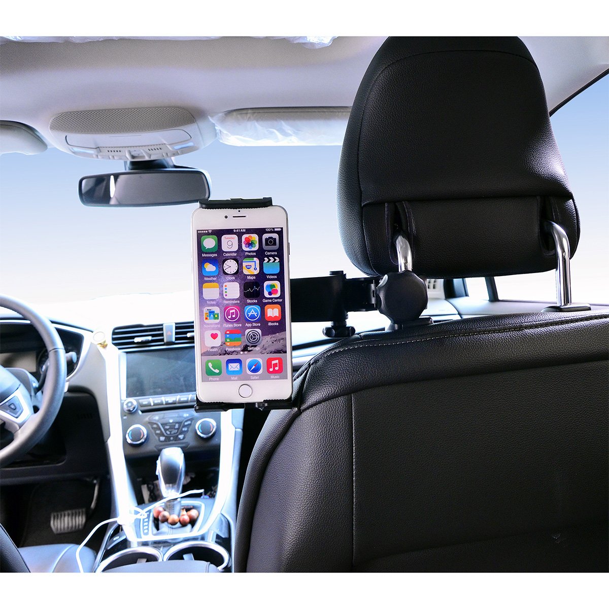 An in-vehicle holder that easily mounts tablets and smart phones in the rear seat at any angle.