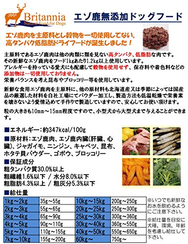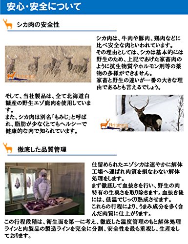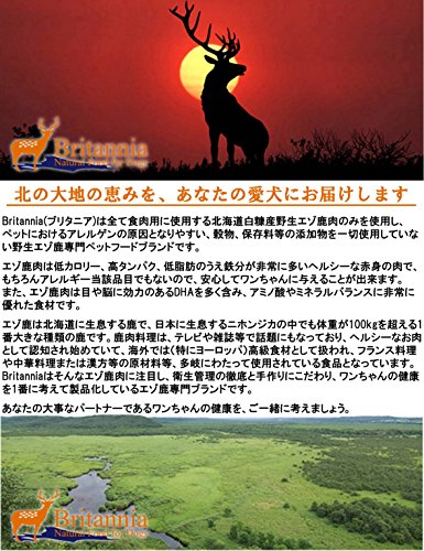 原材料:エゾ鹿肉、エゾ鹿内臓(肝臓、心臓)、ジャガイモ、ニンジン、キャベツ、 昆布、ホタテ貝パウダー、ゴボウ、ブロッコリー