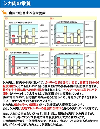 素材構成:粗タンパク30%以上、粗脂肪4.3%以上、粗繊維1.6%以下、 粗灰分5.3%以下、水分8.0%以下 ※野生エゾ鹿肉を主原料としているため、上記数値は季節によって若干変動があります。 あくまで目安参考値としてお考え下さい。