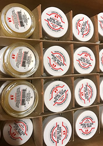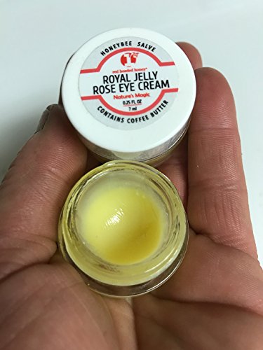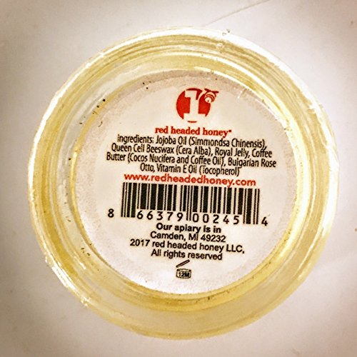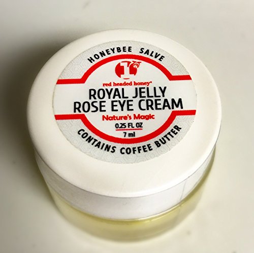 red headed honey's Royal Jelly Bulgarian Rose Eye Cream was formulated to soothe, hydrate and promote regeneration of skin cells. Apply a small amount to the sensitive area around your eyes in a light circular motion, carefully avoiding inside the eye area. This cream can be applied before your makeup. It will help shrink up pores, making a smoother and softer look with your foundation and makeup. After application allow a few minutes for the product to be absorbed. Our non-irritating, formula includes all natural ingredients and contains no Parabens, alcohols or synthetic ingredients. We only use beeswax gathered from Queen Cells in our hives, this provides your skin with 3 x's the amount of antioxidants, amino acids, minerals and UV protection than regular beeswax. The Royal Jelly in our cream is sustainably harvested from our bees during swarm season. Royal Jelly is an amazing substance that gives your skin regeneration properties, balances our natural oil secretion as well as providing minerals and vitamins when we need it most. Our base oil for this rich cream is Organic Jojoba Oil, amazing in its content for being most like our natural skin oil. Our Coffee Butter is carefully selected to ensure the highest amount of free radical fighting properties. Plenty of Bulgarian Organic Rose Oil is packed into each jar, giving your skin the added benefits of redness reduction, acne fighting power as well as plenty of vitamins, including Vitamin C. One of the best skin care secrets is Rosehip Seed Oil applied to the skin to offer hydration as well as antioxidant properties. Vitamin E Oil rounds out our carefully formulated cream, providing antioxidant Properties. Smooth and creamy but not greasy. A little bit will go a long way! This is our Best Selling Product! Our Customers Love our Eye Cream and You Will Too! Click "Add To Cart" and experience nature's best skin care product.Feature