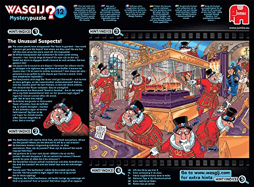 -. Binding : Toy -. Brand : Wasgij -. EAN : 8710126191279 -. Feature : A 1000 piece Wasgij jigsaw puzzle / This Wasgij is a Mystery themed concept where you have to piece together what happens next in the scene / The puzzle has been produced using a high quality cardboard / The finished puzzle measures 68x49cm (approximately) / The crown jewels have disappeared! -. IsAdultProduct : 0 -. Label : Jumbo Games -. Manufacturer : Jumbo Games -. Model : 19127 -. MPN : 19127 -. PackageQuantity : 1 -. PartNumber : 19127 -. ProductGroup : Toy -. ProductTypeName : TOYS_AND_GAMES -. Publisher : Jumbo Games -. Studio : Jumbo Games -. Title : Wasgij Mystery 12: The Unusual Suspects! 1000 Piece Jigsaw Puzzles -. UPC : 787799781135