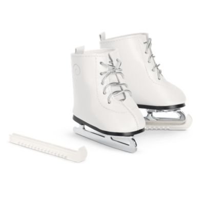 - A pair of white skates with silvery laces and a silvery foil print at the ankle