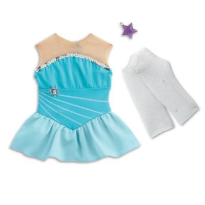 - An ice-blue figure-skating leotard with a chiffon skirt and silvery print at the midsection, plus an attached brooch