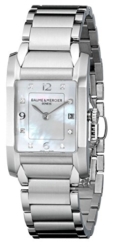 -. Binding : Watch -. Brand : Baume & Mercier -. Department : womens -. EAN : 7612456775642 -. Feature : Rectangle watch with prong-set diamond indices against mother of pearl face featuring sleek two-hand movement and date aperture at three o'clock / 22 mm stainless steel case with anti-reflective sapphire dial window / Swiss-made quartz movement with analog display / Stainless steel band with fold-over clasp / Water resistant to 50 m (165 ft): In general, suitable for short periods of recreational swimming, but not diving or snorkeling -. Label : Baume & Mercier -. Manufacturer : Baume & Mercier -. Model : MOA10050 -. MPN : MOA10050 -. PackageQuantity : 1 -. PartNumber : MOA10050 -. ProductGroup : Watch -. ProductTypeName : WATCH -. Publisher : Baume & Mercier -. ReleaseDate : 2014-09-30 -. Studio : Baume & Mercier -. Title : Baume & Mercier Women's MOA10050 Quartz Stainless Steel Mother-of-Pearl Dial Watch -. UPC : 845858009191