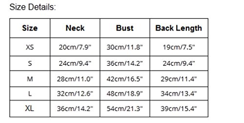 -. Feature : Size:XS-- Neck: 20cm/7.9" --Bust:30cm/11.8" --Back Length:19cm/7.5" / Size:S--Neck:24cm/9.4"--Bust:36cm/14.2"-- Back Length:24cm/9.4" / Size:M --Neck:28cm/11.0" --Bust:42cm/16.5"--Back Length:29cm/11.4" / Size:L --Neck:32cm/12.6" --Bust:48cm/18.9"-- Back Length:34cm/13.4" / Size:XL--Neck: 36cm/14.2" --Bust:54cm/21.3" -- Back Length:39cm/15.4"