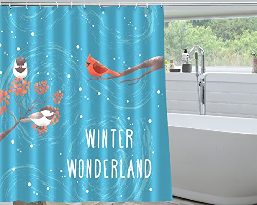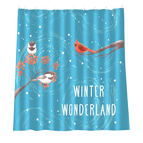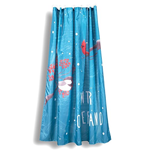 WINTER WONDERLAND SHOWER CURTAIN: This shower curtain features a festive, digital print of robins on tree branches with a snowy backdrop, with 12 hooks for easy installation