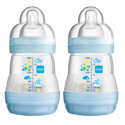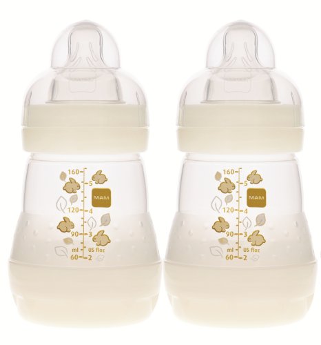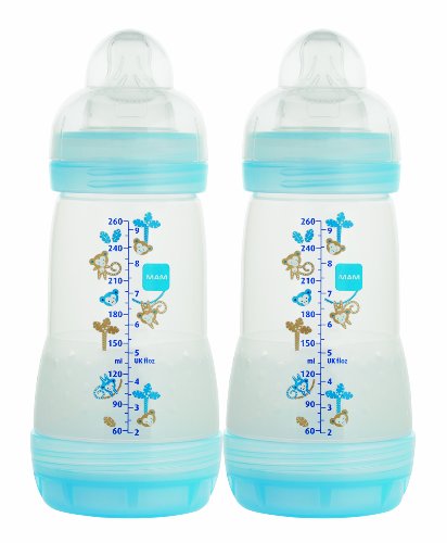 The MAM Anti-Colic wide mouth transition bottle system is designed to be as close to breast-feeding as possible in a reusable bottle. All MAM bottles are constructed of bisphenol -a free materials. The orthodontic nipple is made of ultra soft silicone and encourages baby to use a natural suckling action similar to breast-feeding. The Anti-Colic vented base ensures babies can drink calmly and relaxed. Ventilation holes regulate the pressure balance. The milk can flow evenly without bubbles. Removable bottom makes bottle clean up a snap. Your baby will feed quietly for longer, uninterrupted periods just like breast-feeding. Less air intake means less spit up and gas. Features sealing cap for spill-free travel. MAM shaped orthodontic nipple, BPA free, trusted by mothers for over 20 years. The bottle comes with a wide mouth for easy filling and an easy-to-read scale for accurate measuring. Includes a removable base for easy cleaning. Includes 2- 9 ounce boy bottles, each with 2 slow flow nipples. Can be sterilized in the microwave in just 3 minutesFeature