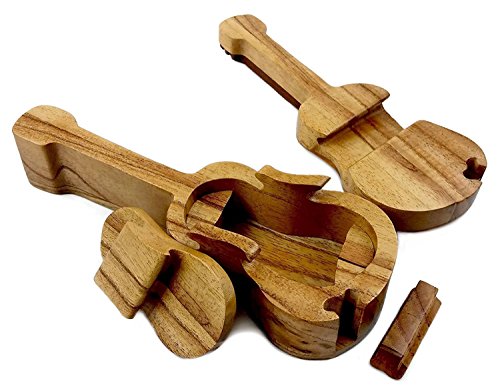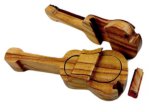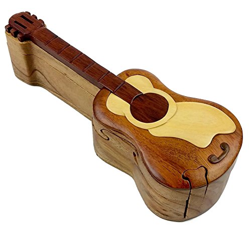 Guitar All Natural Exotic Woods Puzzle Box, 8" X 3" X 2" with Sliding Wooden Key Lock, Sliding Cover and Inner Lid to Hidden Compartment. Hand-made Wood Onlay Design on Lid.