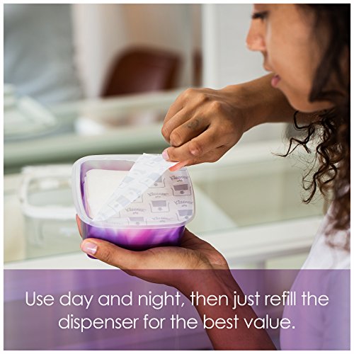 Introducing Kleenex Moist Facial Cleansing Wipes, a convenient, one-step way to radiant skin from Kleenex. An exclusive combination of multi-layered, textured fabric and a gentle cleanser infused with a pro-vitamin complex removes makeup and impurities better than washing with a liquid cleanser alone. Keep the dispenser and pop in budget-friendly refills to keep up to 25 wipes moist and sanitary. The alcohol-free, water-based formula contains aloe, vitamin E, white tea and cucumber extract and leaves no residue, just clean skin. Use these pre-moistened facial wipes day and night to remove makeup, sweat and dirt. Wipes are dermatologist-tested and hypoallergenic for all skin types.