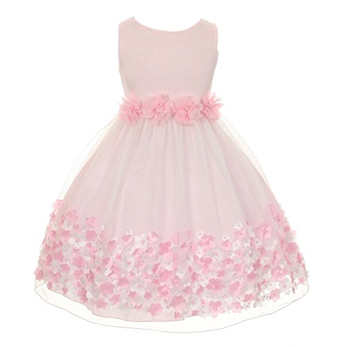 This Kids Dream mesh dress is in bloom with beautiful 3D taffeta rosettes, making it a perfectly precious Easter dress for your little girl. The cute allure brought by rosettes is made even more special by a detachable chiffon flower trim with pearls. The dress is sleeveless and has a crew neckline. A pop of bright pink color gives this dress a stylish touch. Made in USA.Feature